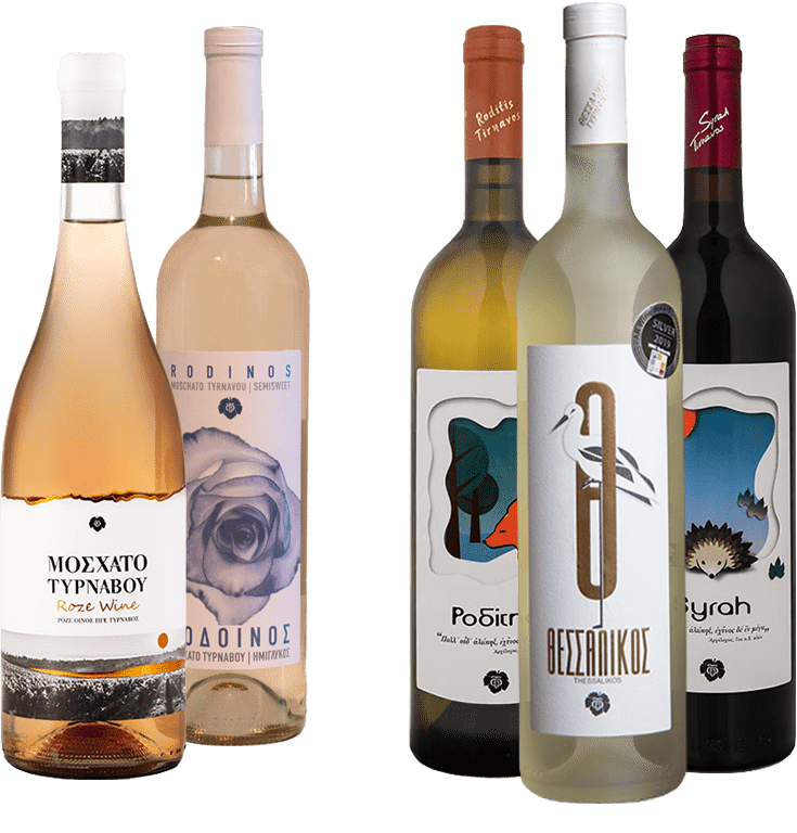 Από τις ποικιλίες που καλλιεργούνται και από το Μοσχάτο Τυρνάβου, παράγονται οίνοι Προστατευόμενης Γεωγραφικής Ένδειξης (ΠΓΕ), λευκοί, ροζέ, και ερυθροί, Ποικιλιακοί Οίνοι, Ρετσίνα, σε φιάλες διαφόρων μεγεθών αλλά και σε Bag-in-Box (ασκός). Από τα πιο σημαντικά κομμάτια των προϊόντων είναι η παραγωγή των αποσταγμάτων. Παράγεται Τσίπουρο Τυρνάβου μονοποικιλιακό από Μοσχάτο Τυρνάβου, σε διάφορες εκδοχές παραδοσιακές και καινοτόμες, ώστε να καλύπτουν διαφορετικές συνήθειες και προτιμήσεις. Παράγεται τσίπουρο με γλυκάνισο, χωρίς γλυκάνισο, με κρόκο (σαφράν), με μαστίχα αλλά και παλαιωμένο τσίπουρο σε δρύινα βαρέλια για πέντε χρόνια, το OLD SPIRIT.