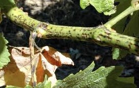 Τα συμπτώματα στους βλαστούς εμφανίζονται στα κατώτερα μεσογονάτια, με τη μορφή κηλίδων, επιμήκη ή κυκλικών, που βυθίζονται στον φλοιό. Σε μεγάλες προσβολές νεκρώνεται ο βλαστός και μετά την ξυλοποίηση οι κληματίδες αποκτούν ένα χρώμα λευκό-γκρίζο. Οι λανθάνοντες οφθαλμοί της κληματίδας δεν εκβλαστάνουν την επόμενη άνοιξη αν η ζημιά είναι σοβαρή.