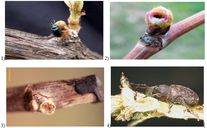 1)Ακμαίο κολεόπτερο Altica spp. τρεφόμενο σε εκπτυσσόμενους οφθαλμούς, 2) & 3) φαγωμένοι οφθαλμοί, 4) ακμαίο ωτιόρρυγχου τρεφόμενο σε νεαρό βλαστάρι.